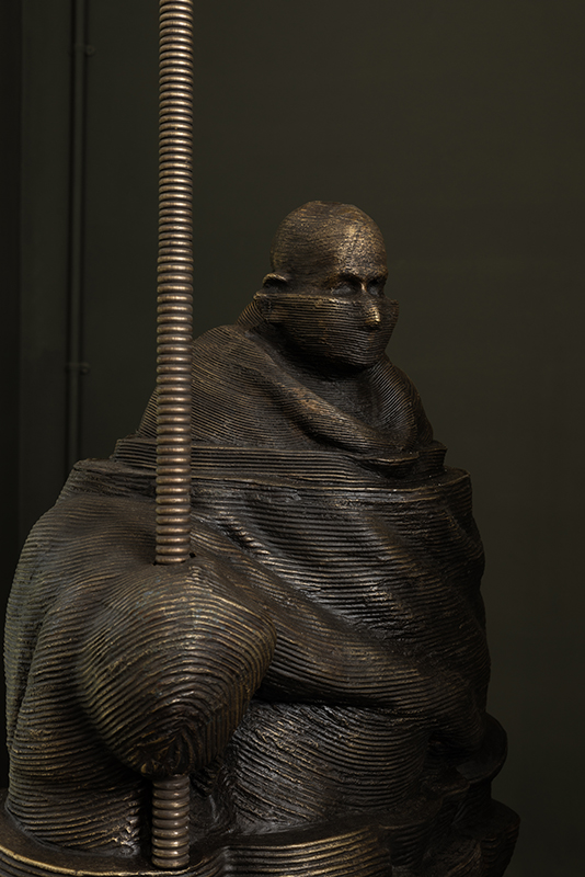 AI programming language Data Weave transforms simple inputs into complex structures. Simple is always complex. Gandhi's simple ideas are now interpreted and complicated according to our contemporary needs. Dhokra casting, an ancient technique where beeswax strings are coiled to create patterns, is used here to try and interpret Gandhi. This process parallels 3D printing technology, where objects are built through an additive process by layering material. Many Dhokra artisans worked like 3D printers, making wax coils to cast this bronze sculpture.